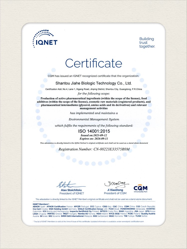 汕頭佳禾生物科技有限公司是一家致力于氨基酸及其衍生物研發(fā)、生產(chǎn)和銷售的國(guó)家高新技術(shù)企業(yè),先后通過(guò)了國(guó)家藥品GMP認(rèn)證,ISO9001質(zhì)量體系認(rèn)證、ISO14001環(huán)境管理體系認(rèn)證。目前,公司擁有“廣東省專精特新中小企業(yè)”、“廣東省氨基酸產(chǎn)品工程技術(shù)研究中心”、“汕頭市生物發(fā)酵工程技術(shù)研究開發(fā)中心”、“汕頭市知識(shí)產(chǎn)權(quán)優(yōu)勢(shì)企業(yè)”、“多項(xiàng)國(guó)家發(fā)明專利”、“廣東省守合同重信用企業(yè)”等多項(xiàng)資質(zhì)和榮譽(yù),旗下“佳禾牌”系列產(chǎn)品已成為原料藥行業(yè)知名品牌。 新泰市佳禾生物科技有限公司成立于2012年8月,注冊(cè)資金2億元,公司位于山東泰安新泰市新汶工業(yè)園區(qū),是國(guó) 家級(jí)高新技術(shù)企業(yè)、山東省“專精特新”企業(yè)、山東省制造業(yè)單項(xiàng)冠軍企業(yè)、泰安市科技型中小企業(yè)、泰安市農(nóng)業(yè)產(chǎn)業(yè)化龍頭企業(yè)、中國(guó)生物發(fā)酵產(chǎn)業(yè)協(xié)會(huì)理事單位。